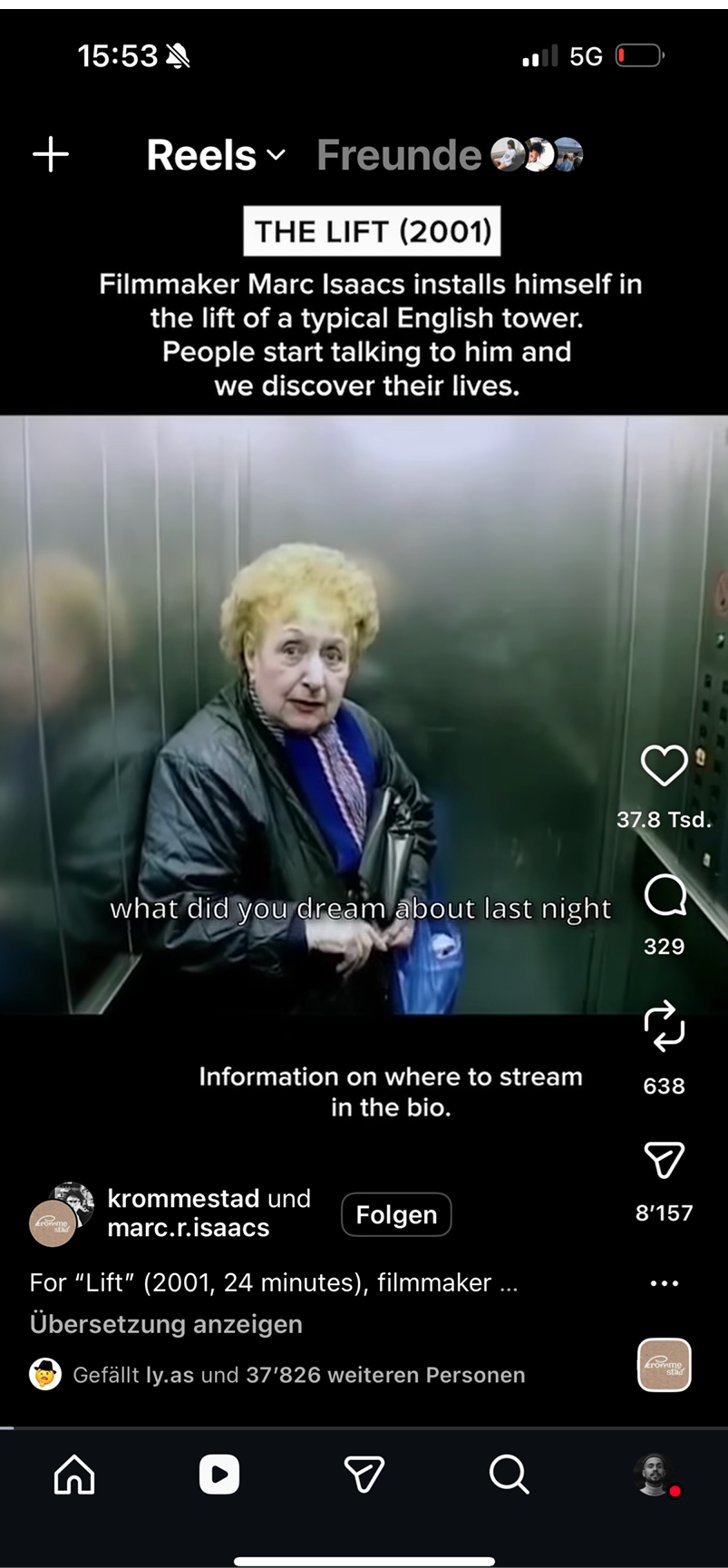 Als eindrückliches Beispiel eines sozialen Zwischenraums im Sinne der Relationalen Ästhetik von Bourriaud möchte ich auf den Kurzfilm «Lift» (2001) von Marc Isaac hinweisen. Durch die konstante physische Anwesenheit des Regisseurs im Lift eines Londoner Hochhauses entsteht über mehrere Wochen ein Ort der Begegnung; die kurzen Momentaufnahmen und Gespräche mit den Bewohner:innen ist die Kunst an sich und die Milieustudie zugleich.