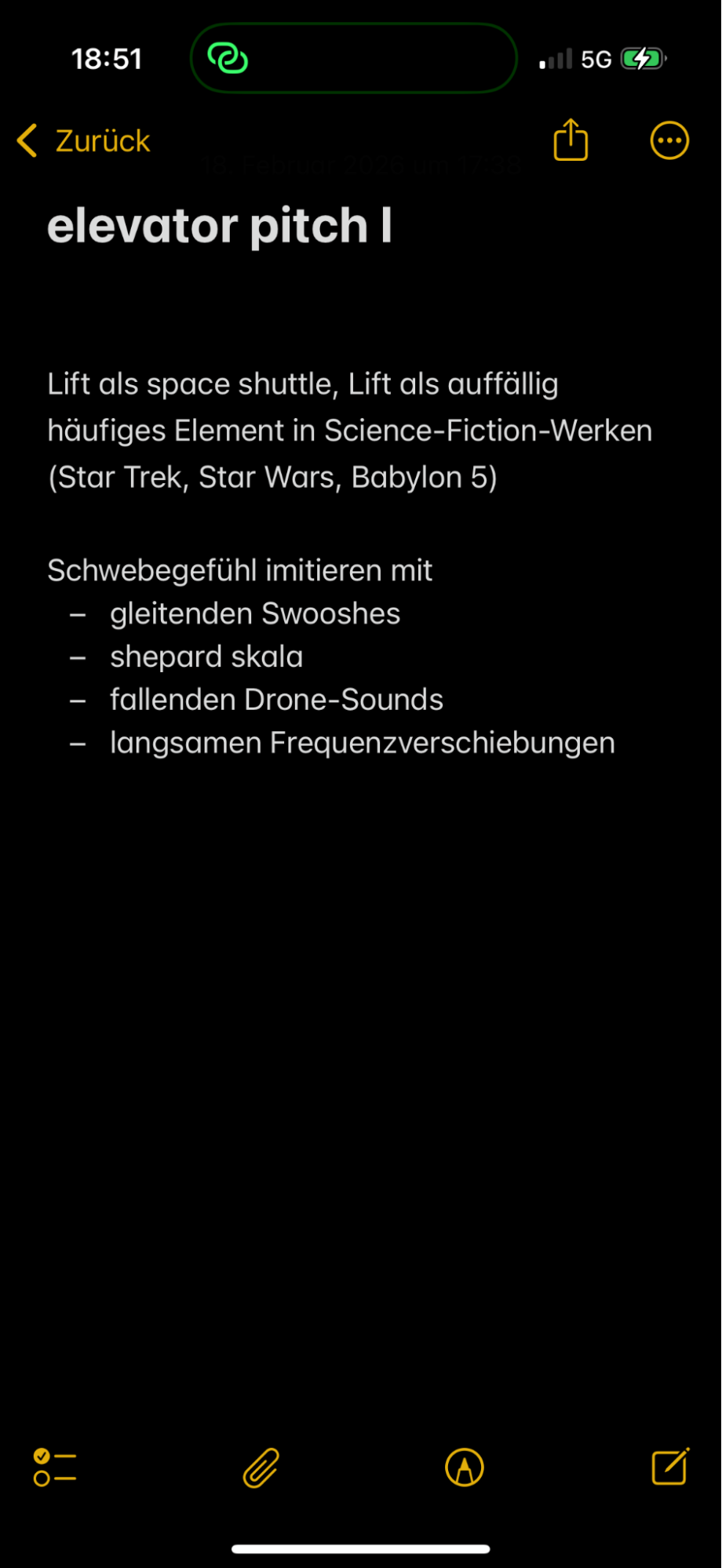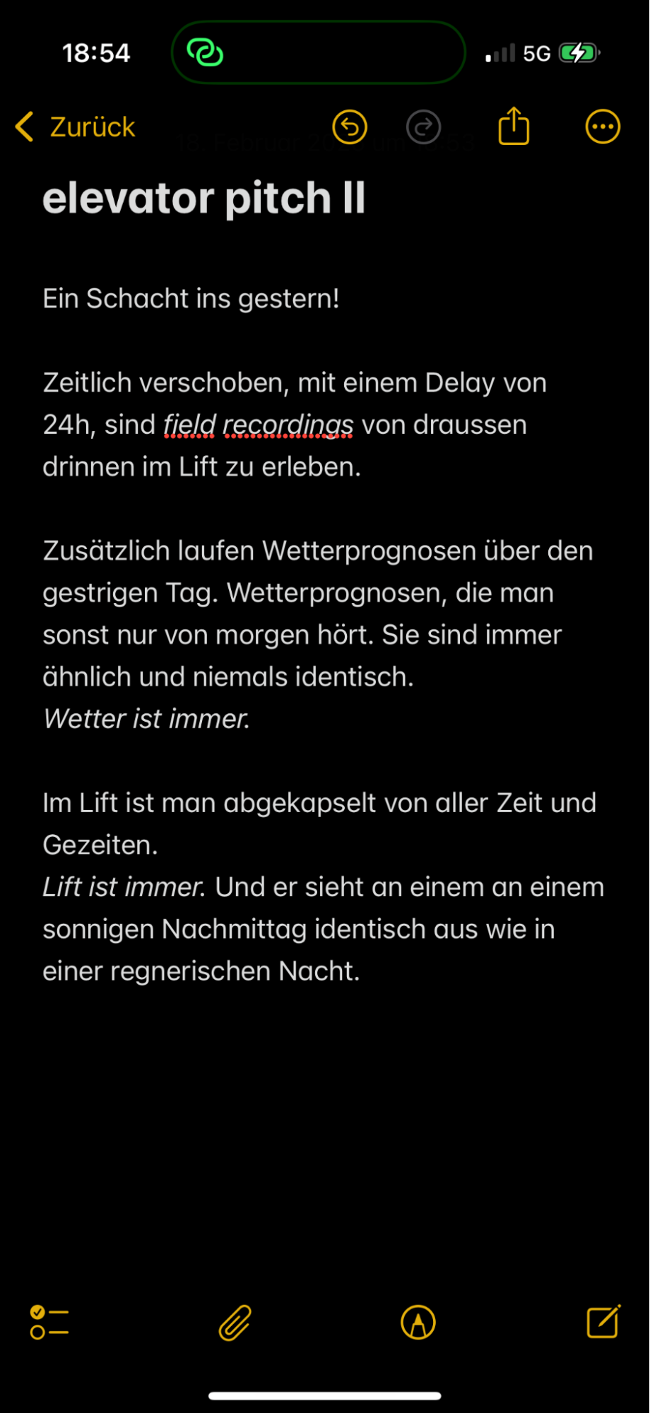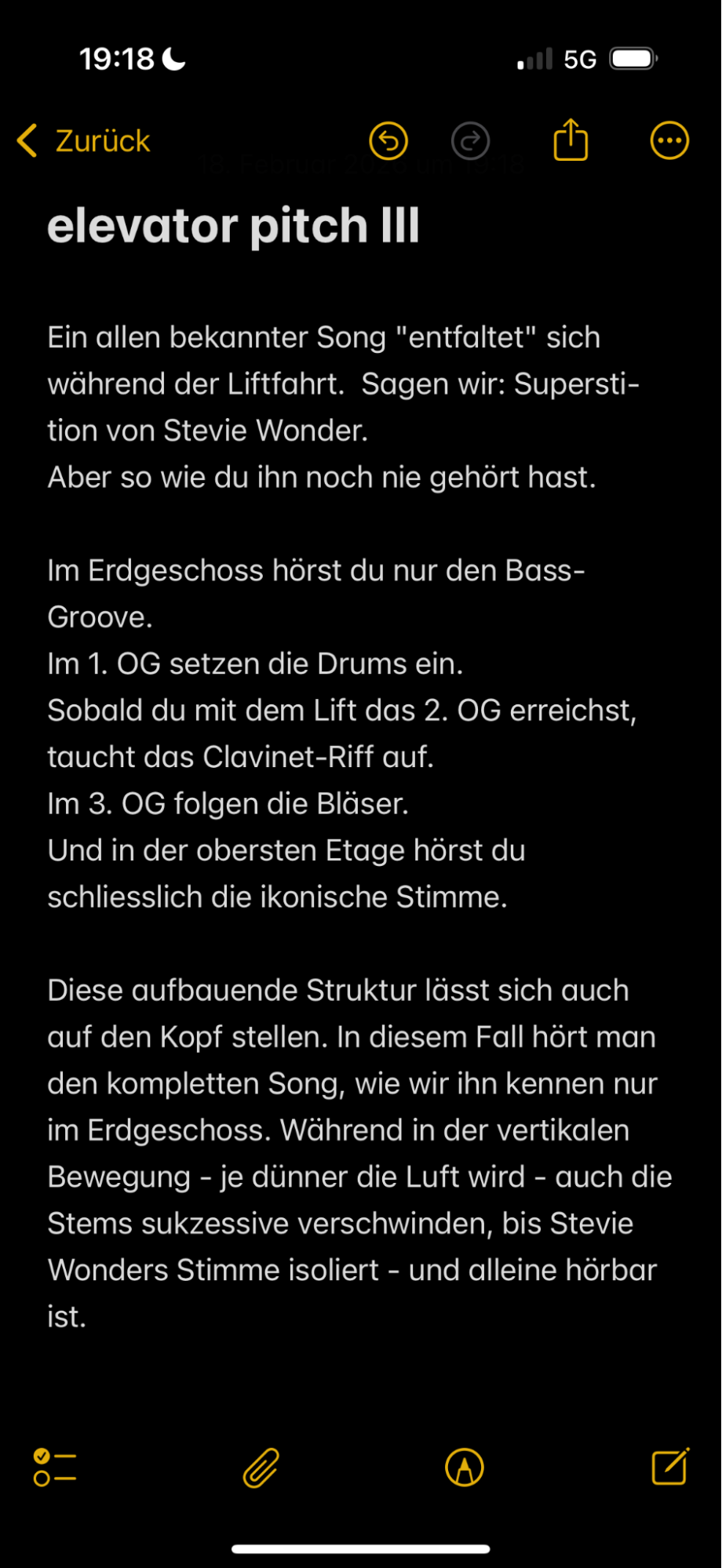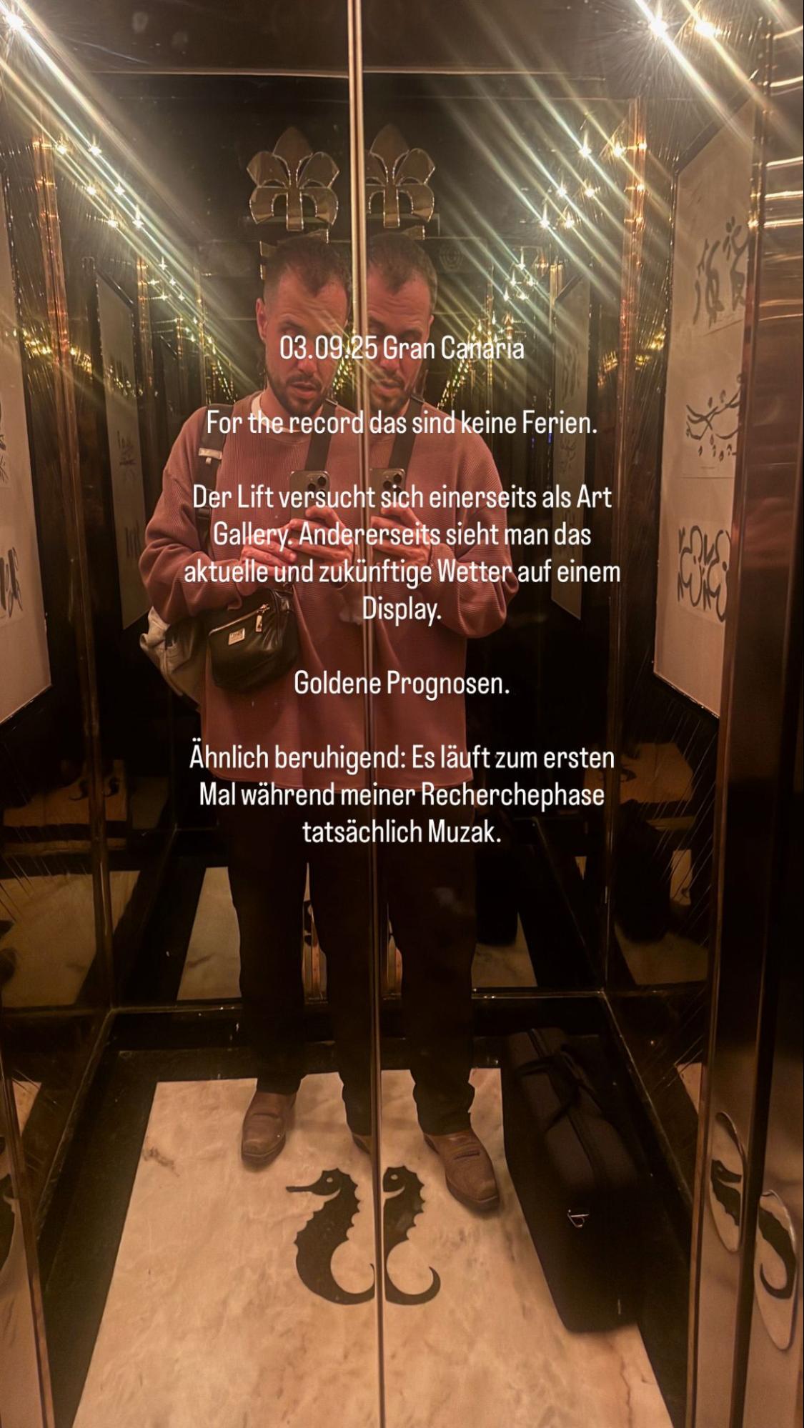 (Und ja, diese Aufzählungsliste erinnert mich an Druckknöpfe in Liften, und wurde auch nur deshalb eingesetzt. Ein klassisches Beispiel von «Fast ein Lift»; wie auch das Smartphone als Objekt und weitere vermeintliche Lifte innerhalb des vertikalen Tagebuchs.)