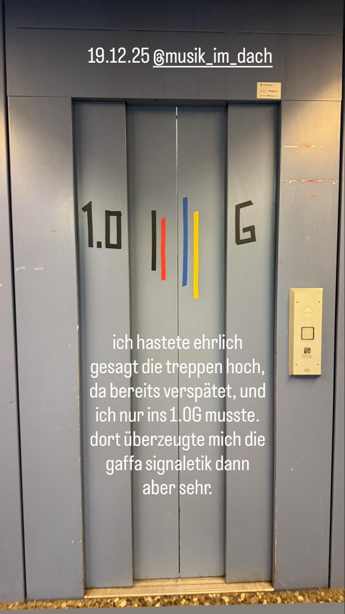 So habe ich den RAUM bei meinen Liftbesuchen am ehesten körperlich erfahren. Die vermeintlich einheitlichen Räume unterschieden sich beim genauen Hinhören/Fühlen beträchtlich. Ein Lift mag immer Lift sein, aber das ICH scheint stark zu variieren, und somit auch die Wahrnehmung der technischen Geräusche, dem Schwebegefühl im Bauch etc.
