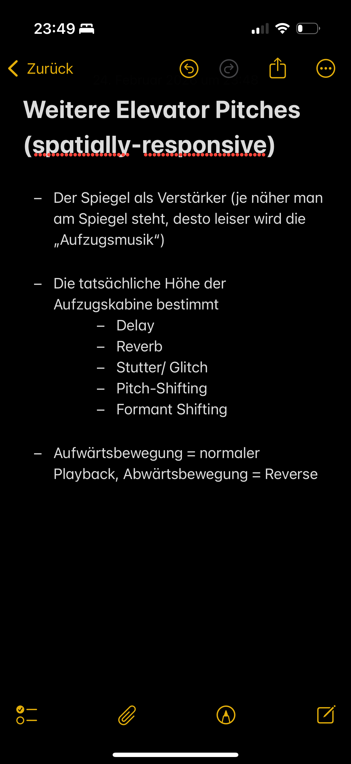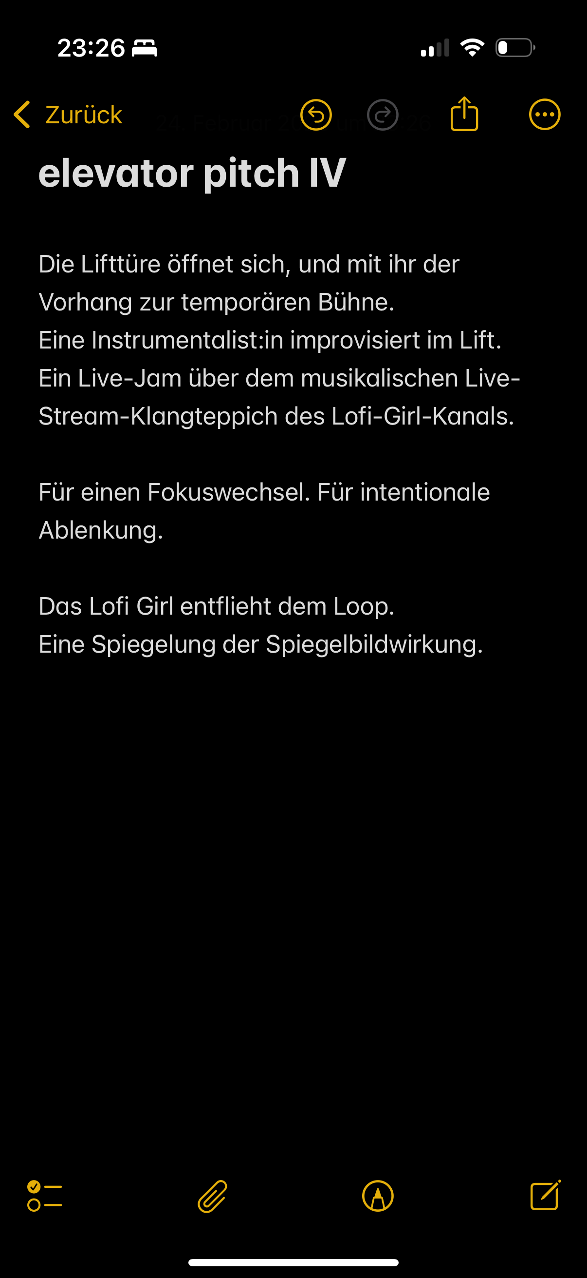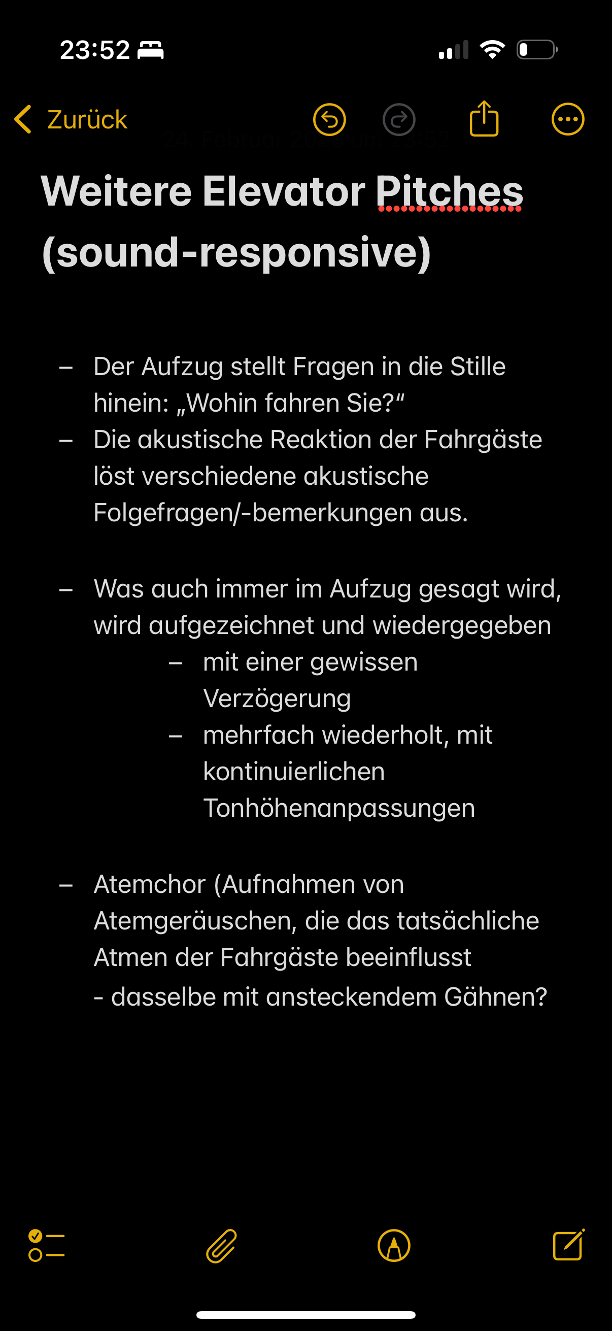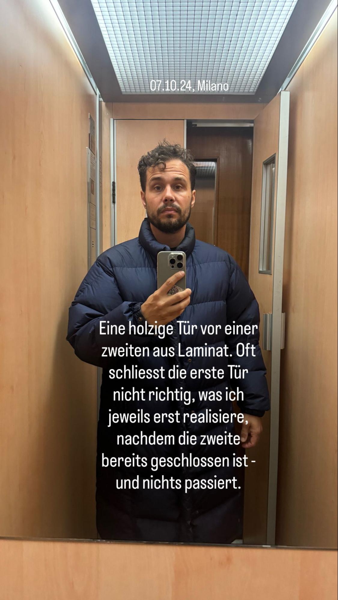 (Und ja, diese Aufzählungsliste erinnert mich an Druckknöpfe in Liften, und wurde auch nur deshalb eingesetzt. Ein klassisches Beispiel von «Fast ein Lift»; wie auch das Smartphone als Objekt und weitere vermeintliche Lifte innerhalb des vertikalen Tagebuchs.)