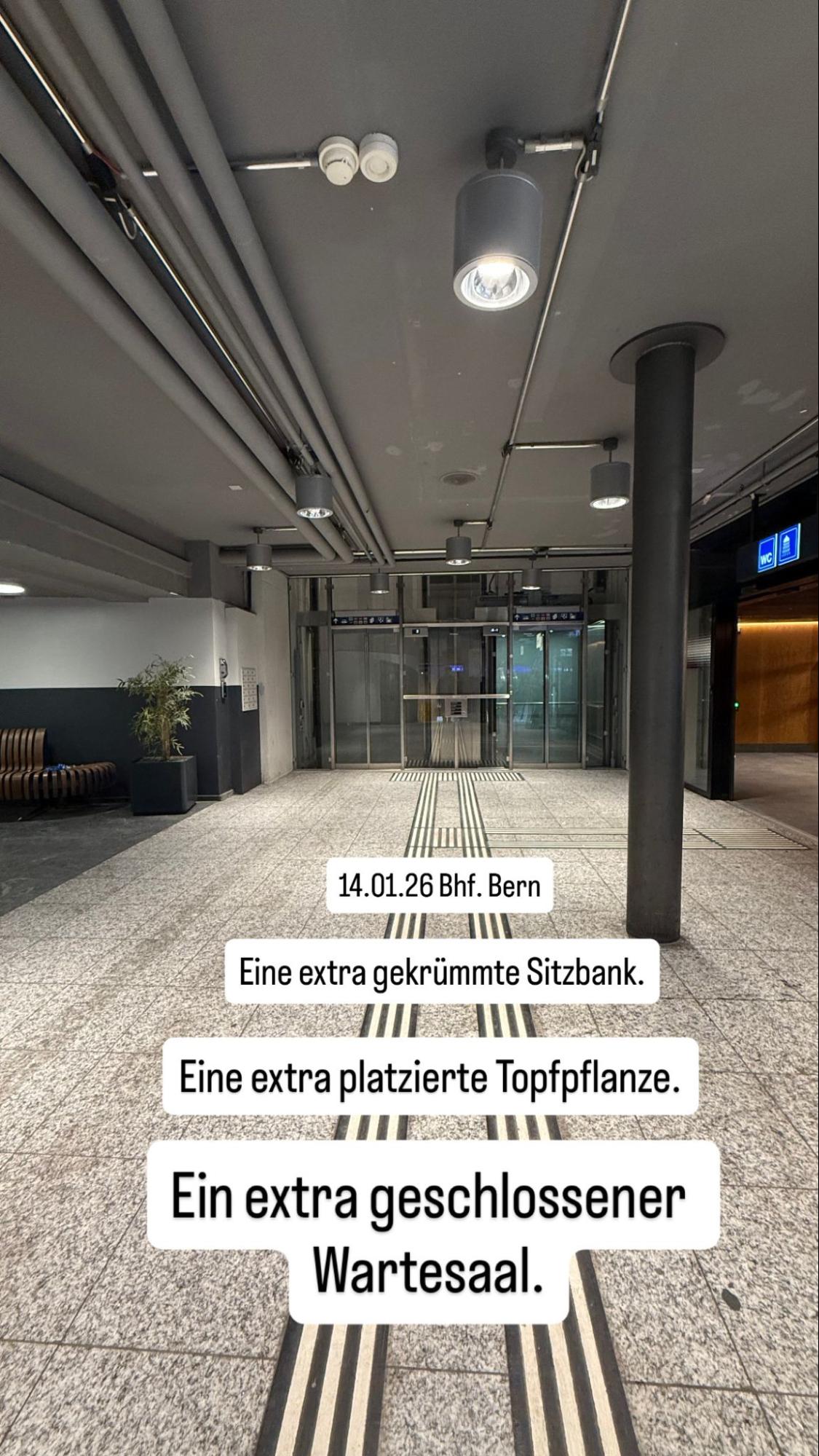 bleibt bis 2029 zu. Berner Zeitung, 20.02.2025. https://www.bernerzeitung.ch/umbau-bahnhof-bern-der-sbb-wartsaal-bleibt-bis-2029-zu-565883763949 (abgerufen am 21.01.2026). [88] Siehe UNTEN im Kapitel