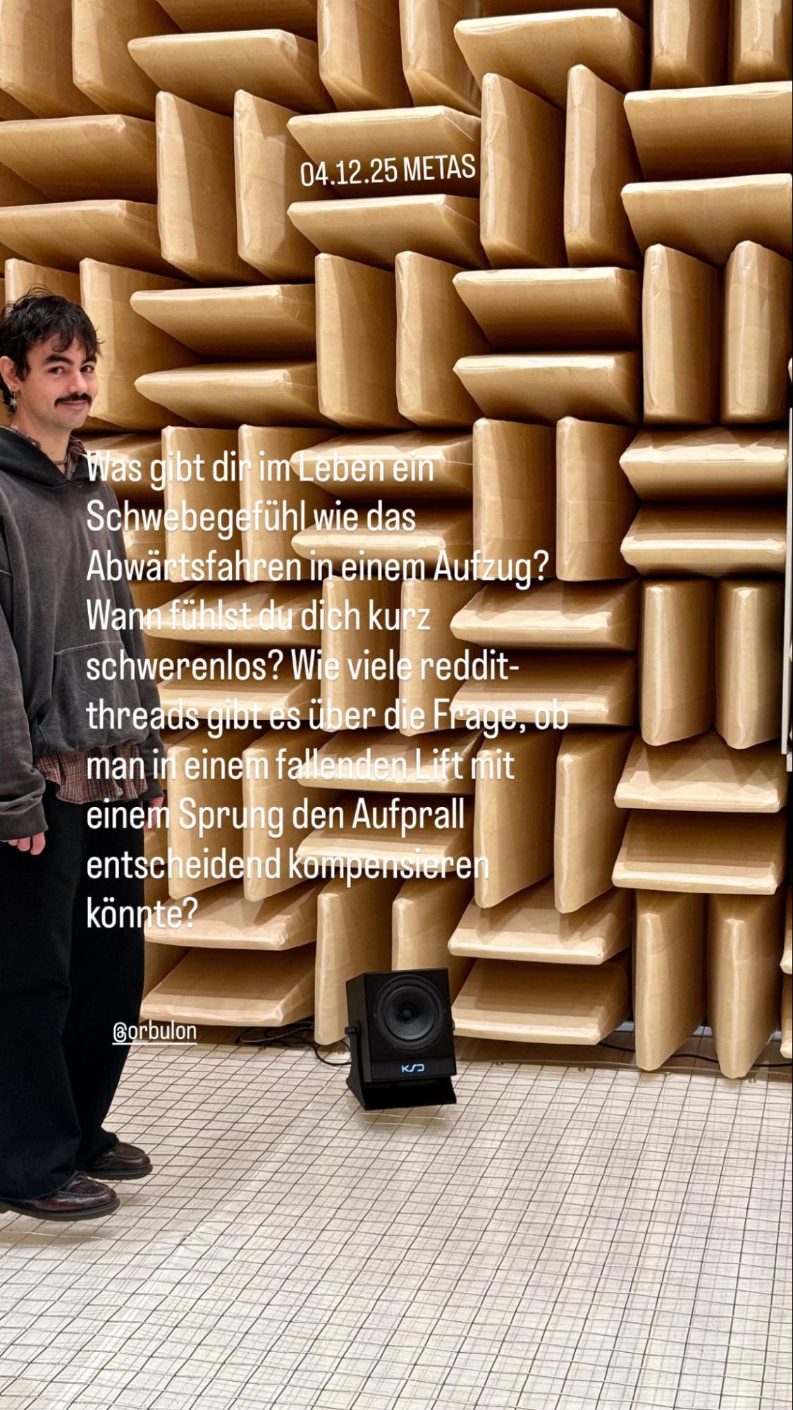 Diese Beobachtungen erinnern mich an unseren kürzlichen Ausflug ins META und den dortigen Besuch der anechoic chamber, einem Raum, der sämtliche Schallwellen und elektromagnetische Wellen absorbiert. Mehrmals wurde ich im Vorfeld darauf hingewiesen, nicht zu lange im Raum zu bleiben, und sicher nie allein, zumal er Beklemmung und Stress auszulösen vermag, und das Gehirn ohne Umgebungsgeräusche und Echo wichtige Referenzen für die Raumwahrnehmung verliert.
