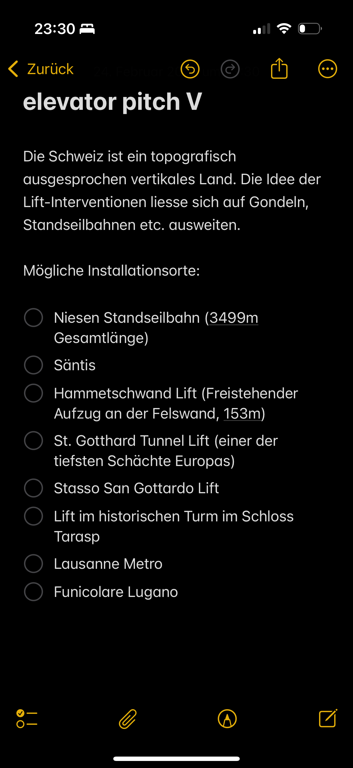 - Ideenskizze möglicher Lift-Interventionen (als elevator pitches im Notizen App)